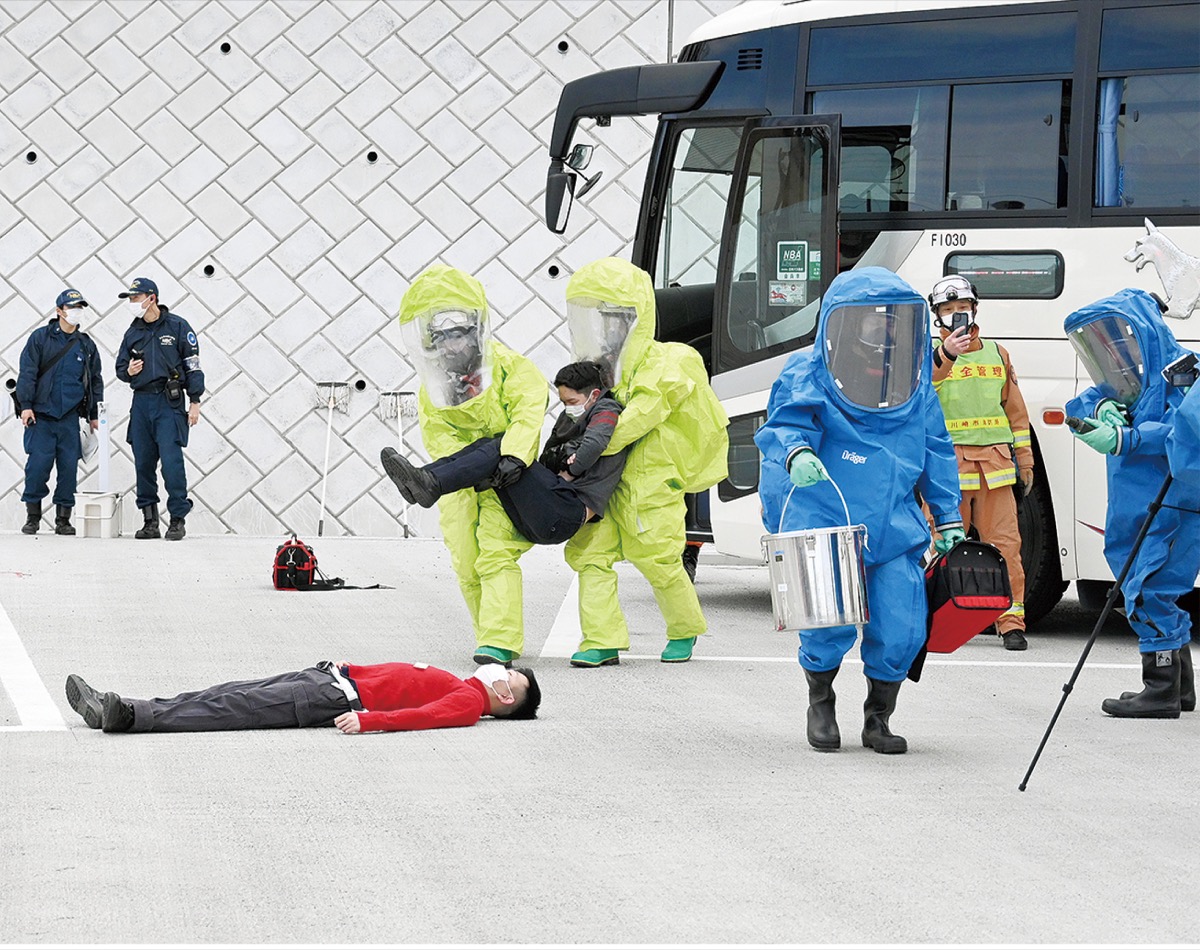 近年、各地の公共施設等で多数の負傷者が出るテロ災害が起きていることから、今回、NBC(核・生物・化学物質)災害を想定した訓練を関係機関と合同で実施することに。麻生署管内で、公共交通機関を使った化学物質を想定した訓練を行うのは、今回が初。
