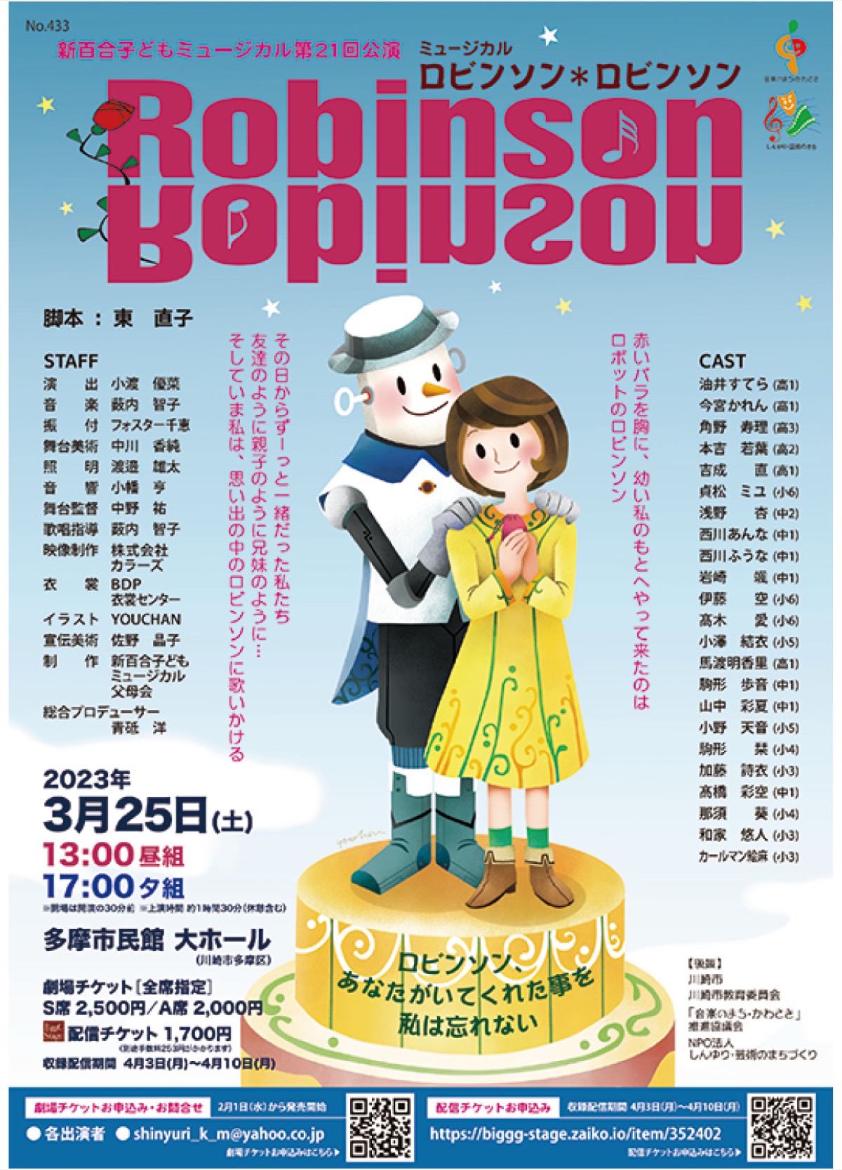 麻生区や近隣の小学生から高校生までが所属する劇団「新百合子どもミュージカル」の第21回公演が、3月25日(土)、多摩市民館大ホールで開催される。