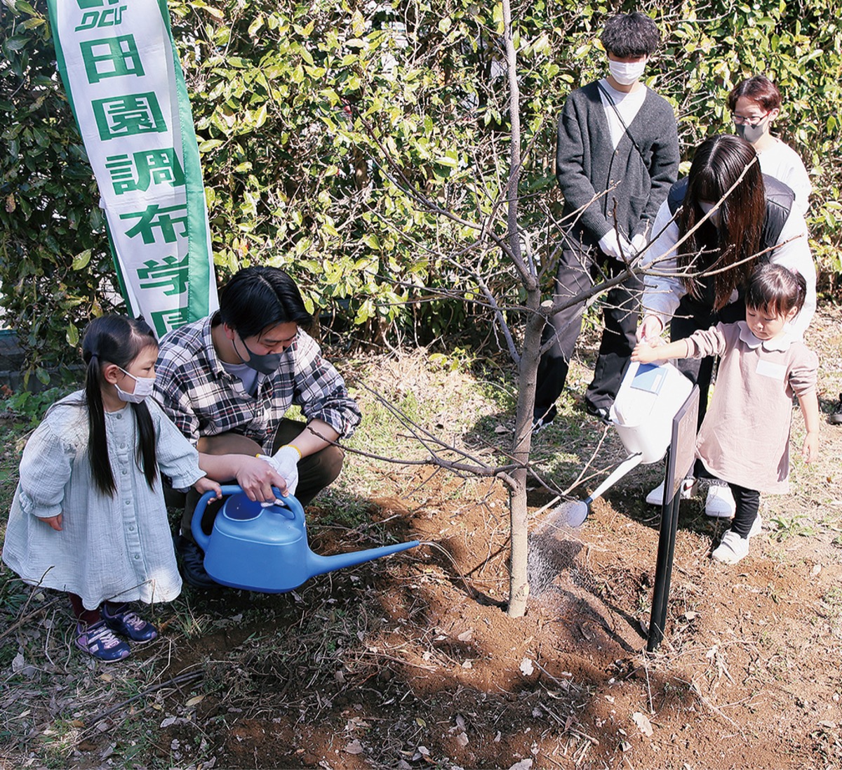 植樹当日は、保存会メンバーや区役所職員、同大学生と、「みらい」に訪れた親子が参加。5号館の庭に、柿の木を植え、参加者で木の周囲に土を被せ水をやった。