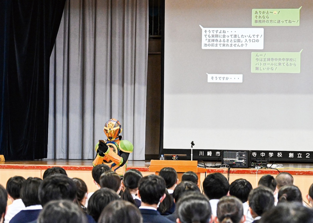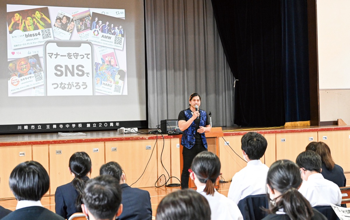 市立王禅寺中央中学校(山本浩之校長)で3月10日、SNSの使用方法を学ぶ講演会が行われた。同中学校区地域教育会議の企画で、川満アート・テイメント(株)(川満スティーブ証社長、岡上)が協力。同社所属のアーティストらによるミニライブを交えた講演会は、ユニークな内容で行われ、同校の1・2年生215人がSNS使用時の注意点などを学んだ。