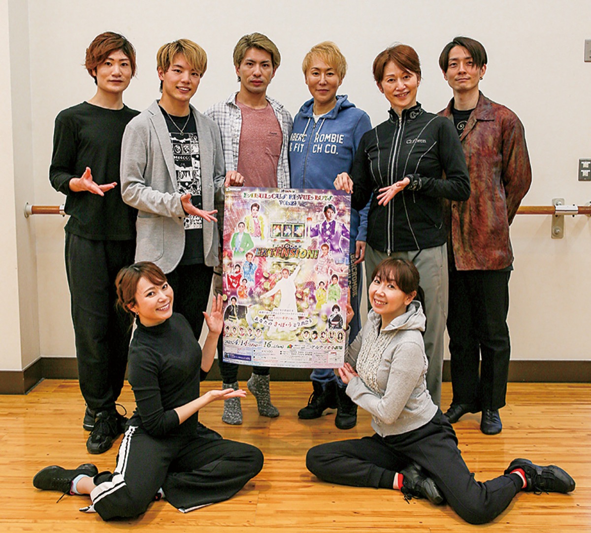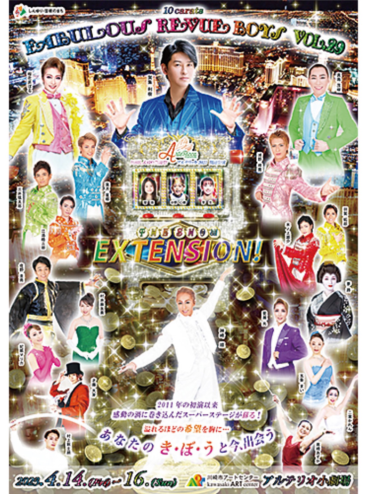 かわさき産業親善大使の俳優・神崎順さんが作、演出、振付を手掛け、新百合ヶ丘での公演は16回目。「エクステンション」のタイトルで、希望をテーマに、バトンやシルホイール、マジックなども登場する華やかなショーだ。出演は賀集利樹さん、真島茂樹さん、桜花昇ぼるさんら。神崎さんは「サーカスとレビューの融合のような、これぞエンターテインメントという作品。『和製レビュー』を世界に発信したい」と話す。