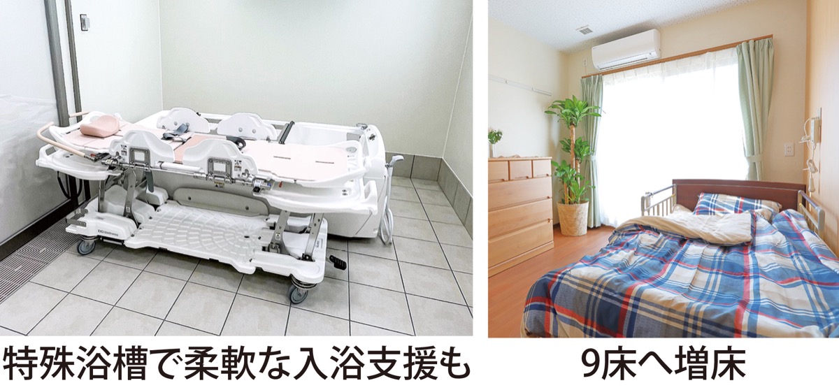 小規模多機能からのリニューアルにより、全自動の特殊浴槽を新設。5床から9床に増床し、リハビリが受けられるデイサービスエリアも拡充した。設備だけでなく、褥瘡等の処置を行う皮膚・排泄ケア認定看護師(WOC)や、フットケア指導士の資格を持つ看護師も配置。医師の指示に基づいて、空気圧を利用したマッサージ機「メドマー」でリンパ浮腫等へも対応していく。同社の看護師管理者、支え合いの管理者でもある山上さんは「栗木ののどかな自然の中に佇む施設を、ぜひ直接ご覧いただければ」と話している。