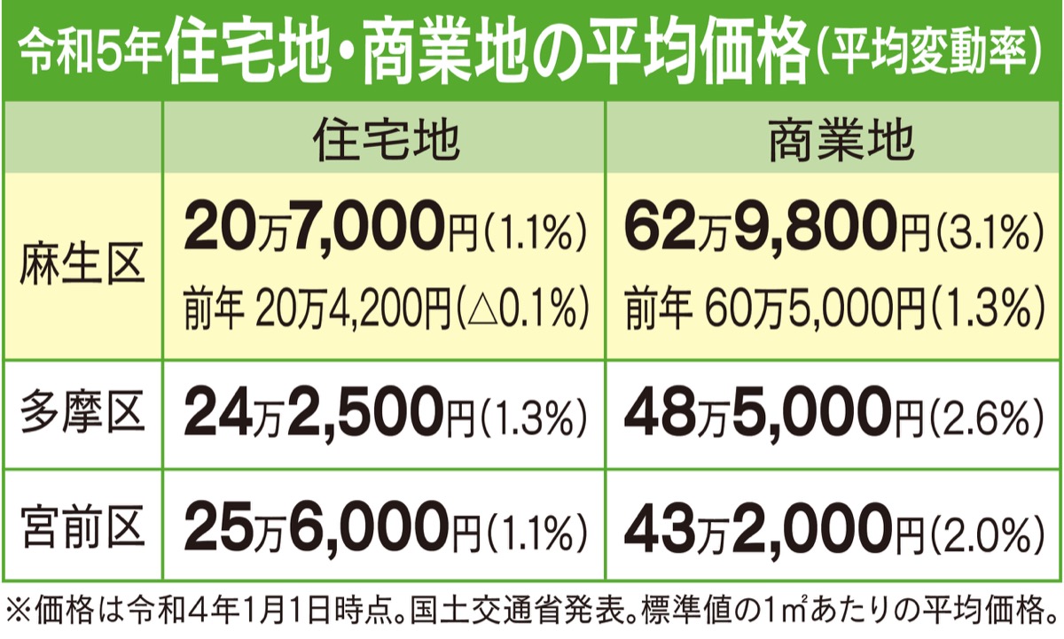 国交省が今年3月に公表した令和5年の公示地価では、都心に近い川崎市の住宅地は上昇傾向が強く、価格変動率は1・7%と上昇率が拡大。麻生区1・1%増で、35地点中28地点で上昇した。起伏のある地勢や交通利便性に劣る地域でも、コロナ禍における在宅時間の増加から、広い敷地を求めるような住環境の改善を望む需要増などが見られるという。商業地の変動率も3・1%で、大幅な上昇となった。