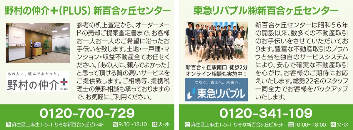 将来に備え、自宅の価値や評価は家族と共有しておきたいもの。そこで本紙では春の特別企画として、不動産大手の2社(東急リバブル、野村の仲介+(PLUS)※各新百合ヶ丘センター)と協力し不動産を無料査定。本紙が取り次ぎ2社一括で依頼することで、自宅の資産価値を比較でき、各社の視点を踏まえ今後の住まいや不動産全般の相談も可。まずは当編集室へお問合せを(左記)。