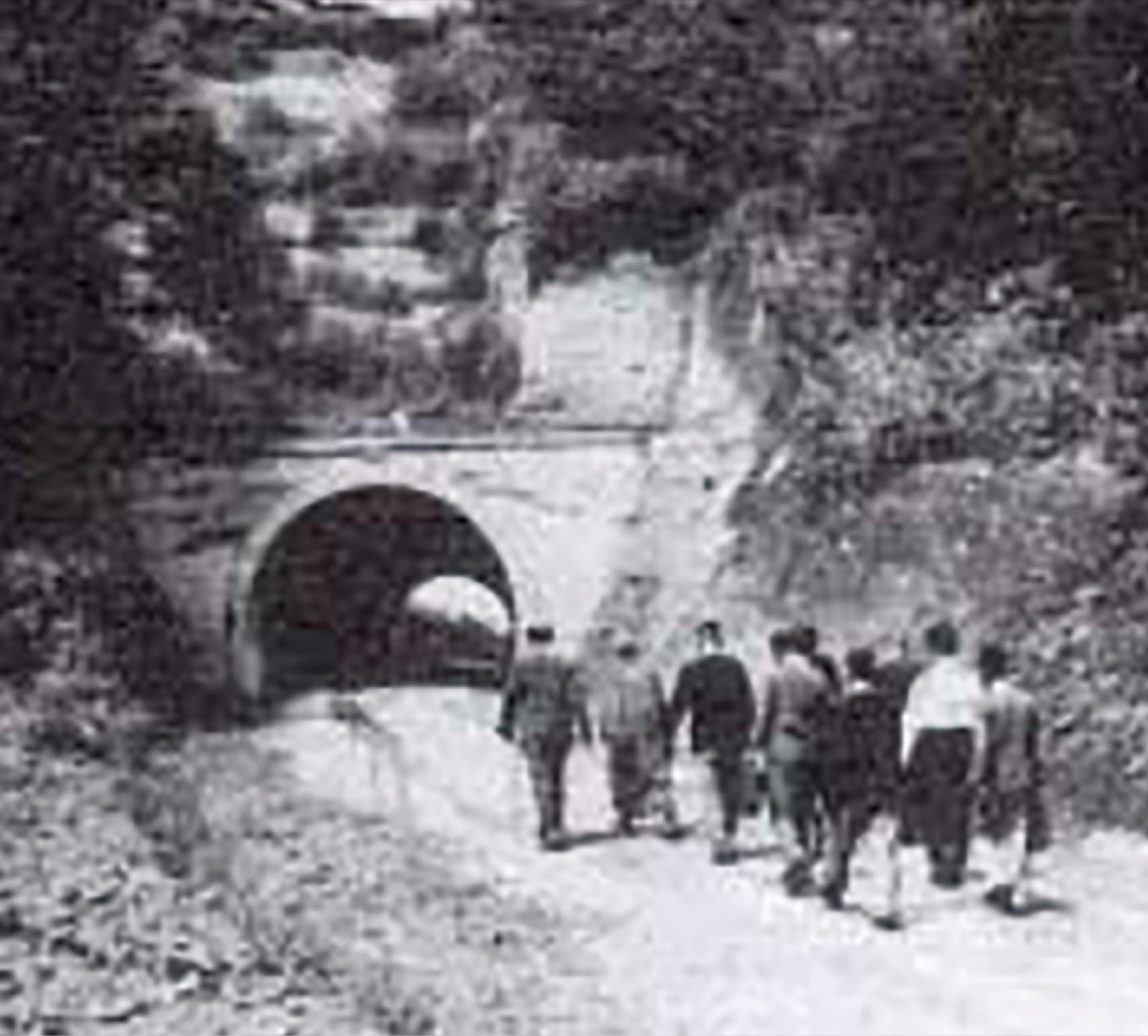 実は、下駄切坂をトンネルで抜ける道路を建設し、柿生市街地から陸の孤島となっている真福寺、王禅寺、早野との行き来を楽にするプランは、戦中から存在していました。現実に真福寺の信号から、しばらく先まで道路が整備され、1944(昭和19)年には、軍部の了解の下、上麻生側に向けトンネル掘削工事が始められたのです。戦時中で若者はほとんど従軍していましたから、真福寺、王禅寺、早野、下麻生の4集落の大人たちが、日替わりで労力を提供し、つるはしにモッコを担いで、まさに手掘りに近い形で掘り進めたのです。しかし残念ながらこの時の工事は完成に至らず、戦局が一段と悪化したために、中断のやむなきに至りました。