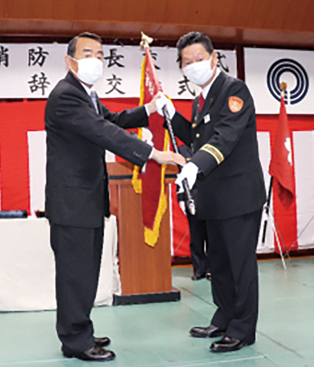 麻生消防団の第8代団長に碓井(うすい)純さん(71)=人物風土記で紹介=が4月1日付けで就任。16日に麻生消防署で団長交代式が行われた。