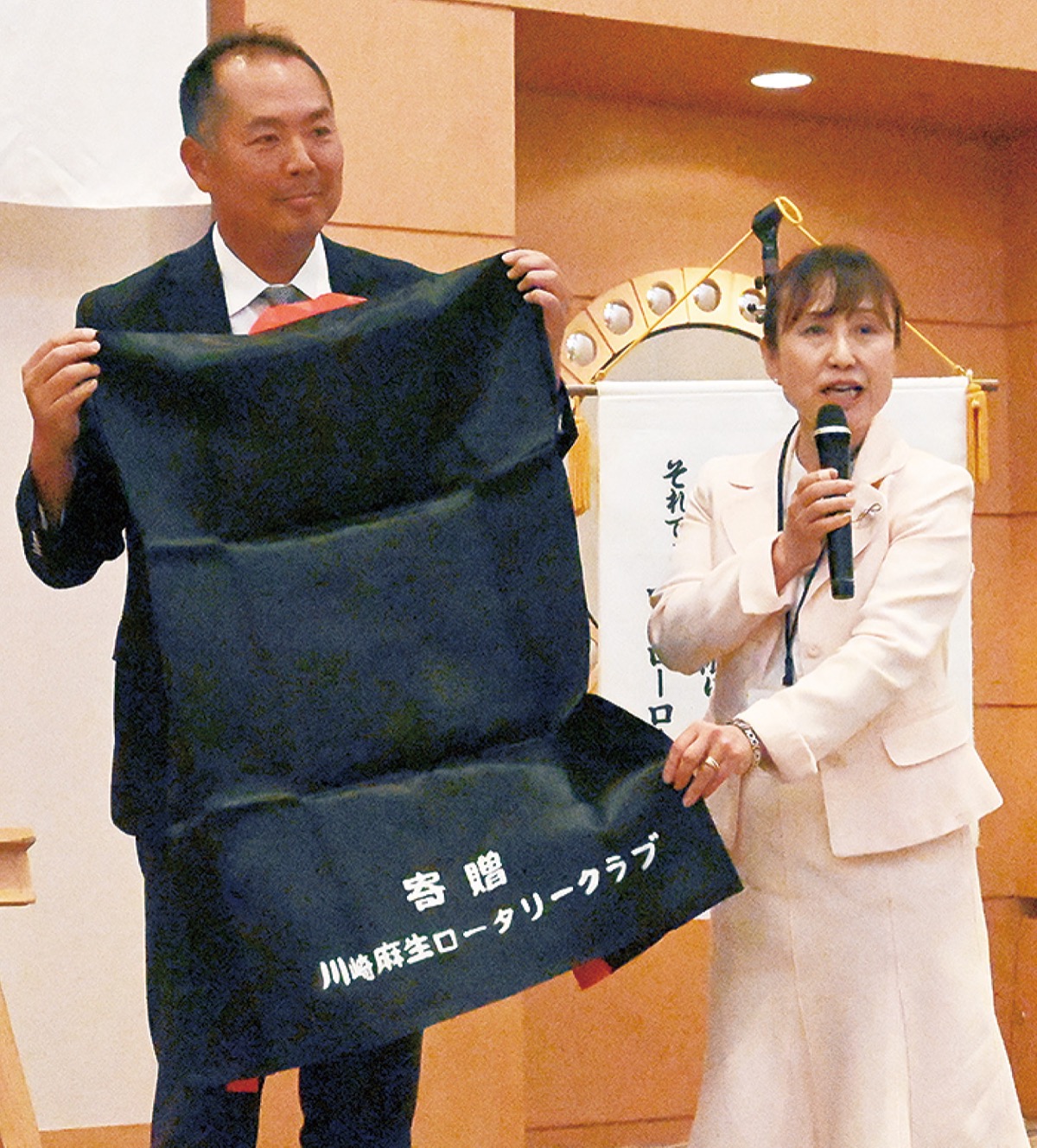 川崎麻生ロータリークラブ(宇津木茂夫会長)は5月12日、5月の第1会例会をホテルモリノで開催し、社会奉仕活動の一環として、今年創立150周年を迎える市立柿生小学校に記念品の目録を贈呈した。宇津木会長は「子どもたちに元気よく使用してもらいたい」と祝辞を送った。