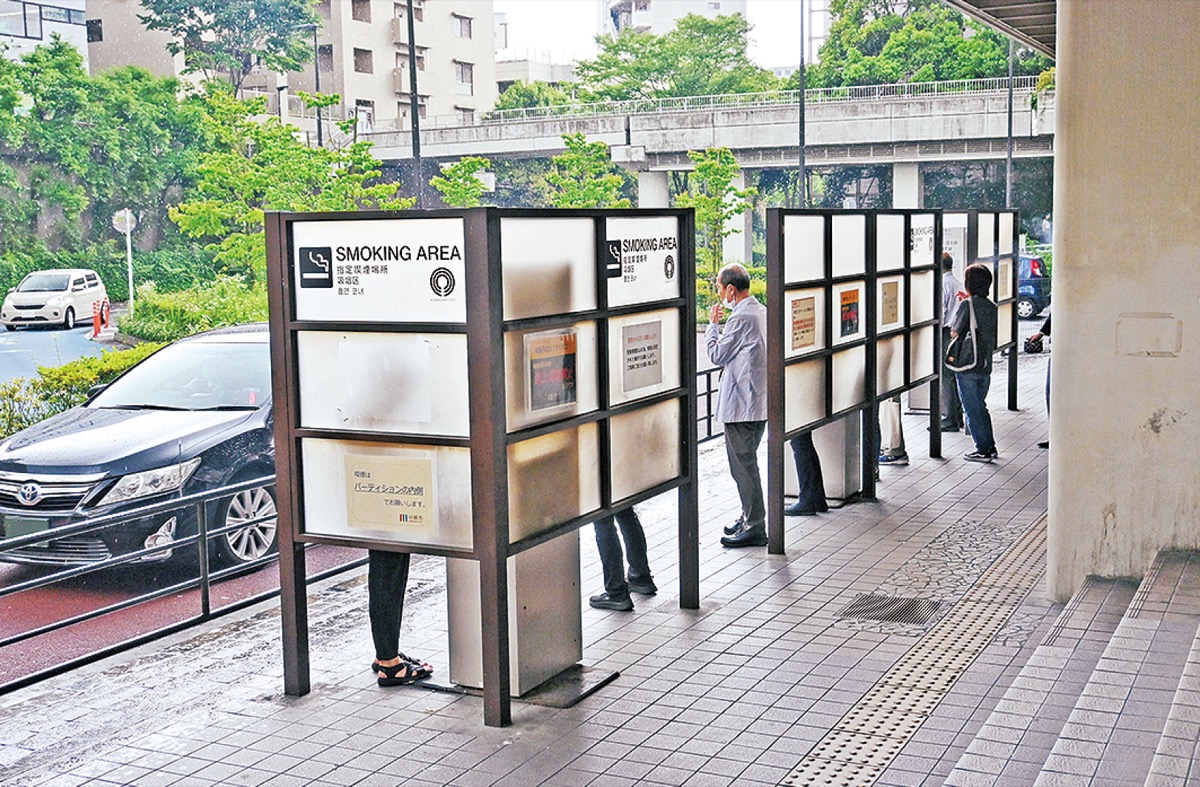 厚労省は、屋外の喫煙場所設置に関する目安として「人通りの多い方向に、たばこの煙が容易に漏れ出ないようにする」ことを求めている。パーテーション型の場合、「高さ2〜3メートルの壁」「出入り口に方向転換のためのクランクがあること」などを具体例として挙げる。しかし、市内に設置された14カ所の屋外指定喫煙場所で、この目安を満たしているのは4カ所(武蔵小杉駅前、川崎駅前2カ所、武蔵溝ノ口駅前)。そのほかの10カ所は、クランクがなかったり、天井や天井の勾配がないなど留意事項を満たしていない。