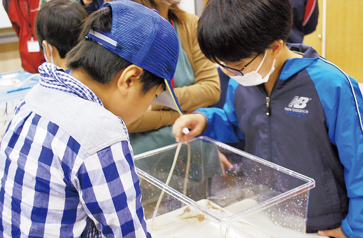 説明会の後には、実際に生物に触れる観察コーナーが設けられ、水槽中の魚たちと目線を合わせて楽しむ子どもたちの姿が見られた。