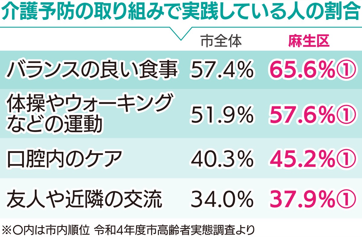 市の高齢者実態調査によると「1日15分程度歩ける、歩いている」の割合が麻生区は市内で最も高く、介護予防の取り組みとして、バランスの良い食事や、口腔内のケア、友人や近隣との交流なども市内で一番高かった。またがん検診の定期的な受診についても、宮前区に次いで2番目に高い結果となっている。
