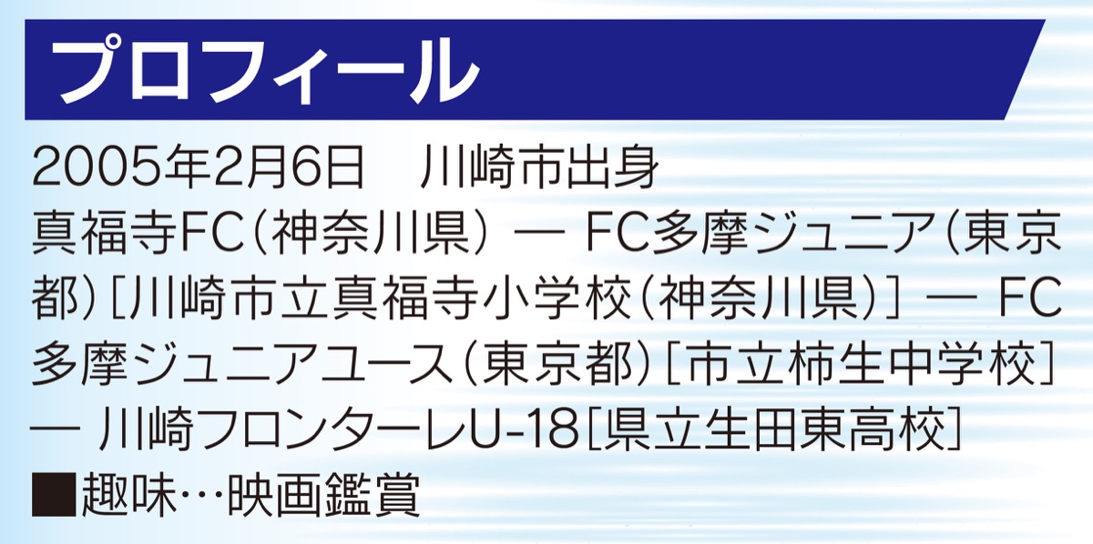 フロンターレのレジェンド・中村憲剛さんに憧れ、その後継者・脇坂泰斗選手を目標にする「未来の司令塔」。公式戦の出場はまだないが、選手として大きな刺激を受けた夏となった。一つはドイツ1部リーグの強豪バイエルン・ミュンヘンとの親善試合に出場したこと。ピッチに立ったのは15分という時間ではあったが「5万人近くのサポーターの前でプレーできたことがうれしかった。公式戦のピッチに立ちたい思いが強くなった」と語る。