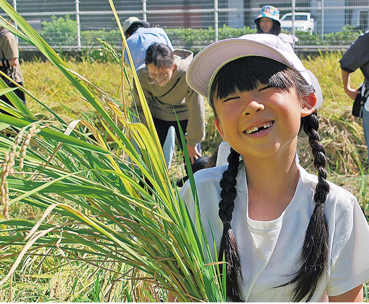 今回の稲刈りは、同校児童を対象に放課後の学習支援等を行う「寺子屋わかたけ」の体験活動のひとつ。その活動の一環で、今年は新たに米作りを企画し、6月に行った田植えに続いて、今回は稲刈りを行った。