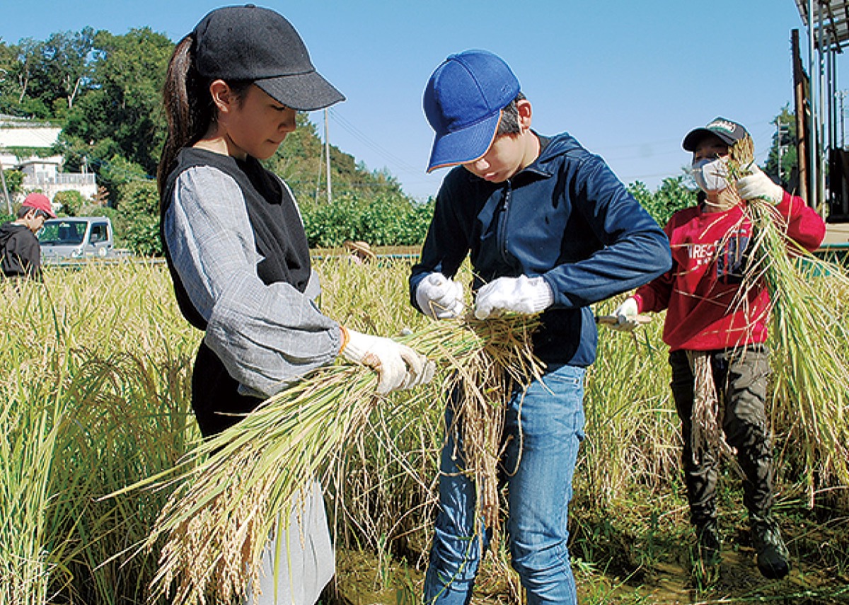 初めて稲刈りを体験したという小川颯介さんは「力加減が難しかった。刃の根本を稲にくっつけて引くというアドバイスをもらったらすっと切れた」と振り返った。