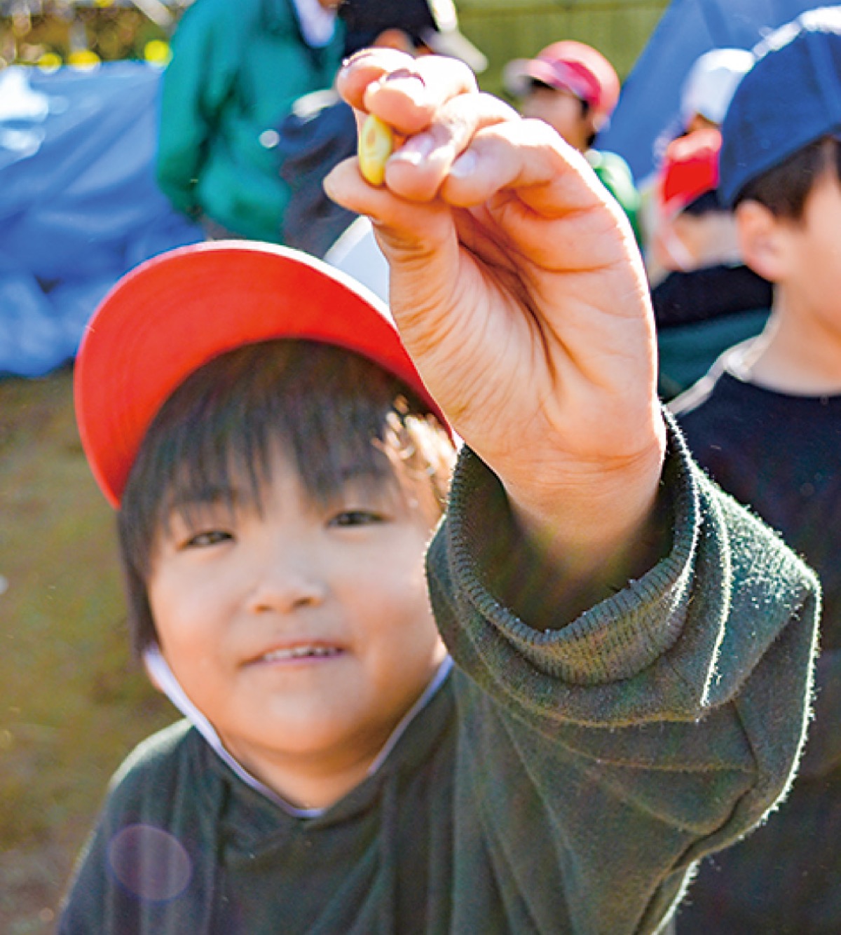 市立岡上小学校(岩倉義則校長)の3年生が11月29日、同校近くの畑で6月に種植えをした大豆の収穫を行った。