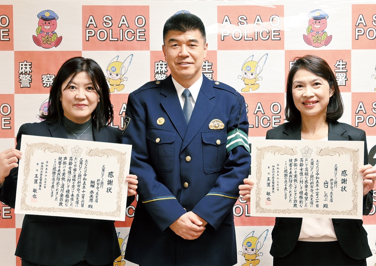麻生警察署(玉置敏也署長)は12月1日、特殊詐欺防止を未然に防いだとして、三菱UFJ銀行新百合ヶ丘支店の飯塚奈美恵さん(49)、山口しのぶさん(58)に感謝状を贈呈した。