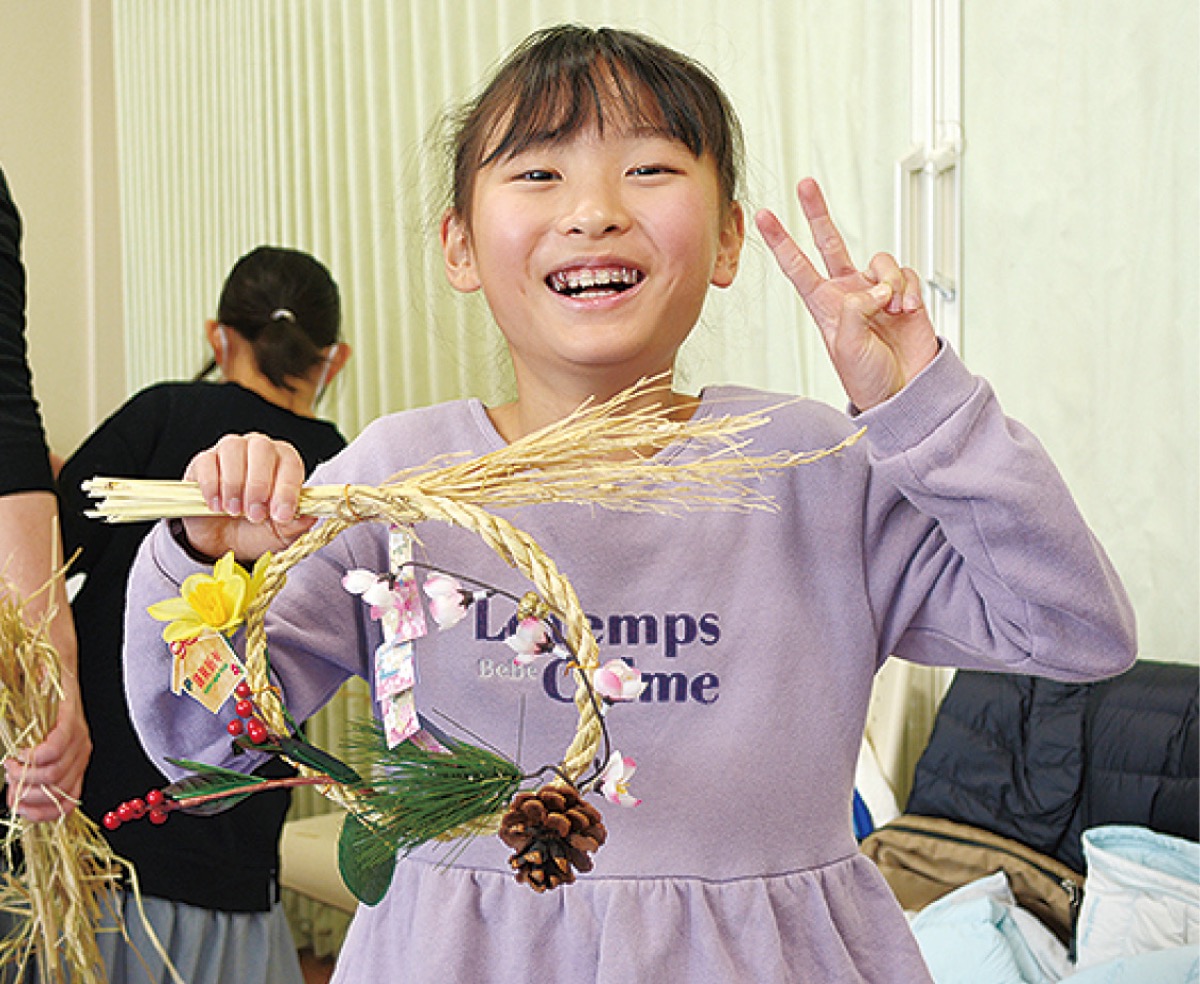 当日は同実行委員会の井上俊夫実行委員長が、しめ縄の作り方を紹介。数本のワラを一つにまとめるようにねじり編んでいく「綯(な)う」作業を行いながら手本を示した。子どもたちも井上委員長に続き、挑戦。乾燥したワラは折れやすく、苦戦する姿が見られたものの、しめ縄飾りを完成させた。前田澪さん(5年)は「初めはちぎれてぐちゃぐちゃになり、難しかった。花をいっぱいつけたのがポイント」と笑顔を見せた。