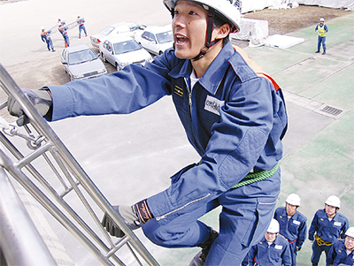 彼らは昨年採用された新人消防士。川崎市の消防職員は、入庁後3ヵ月間は厚木市の県訓練施設で座学中心の初任教育を受け、実地訓練を宮前区犬蔵で2ヵ月間受ける。教官の先輩消防士から用具や服装の点検、梯子にかける足の一動作まで厳しく教え込まれるのだ。
