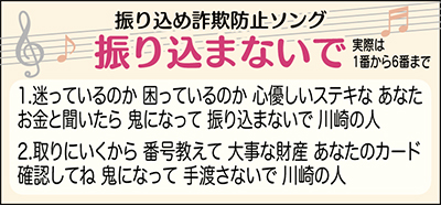 増加し続けている振り込め詐欺被害を、歌で防止しようと、小平博川崎警察署副署長が、CMの楽曲にのせた替え歌『振り込まないで』を作詞した。今月下旬から県警主催のイベントや川崎駅周辺の大型商業施設で流す。
