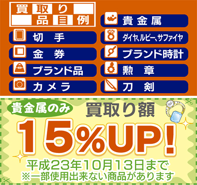 タウン付属のクーポンを持参で貴金属の買取り価格がさらに15%UPするというから驚き。