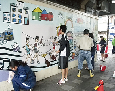 壁画は落書きを防ぐだけでなく、ガード下を明るくし、犯罪抑制につなげることを目的に作られた。全長25m×高さ2・60mの”キャンバス”には音符や楽器、マラソンランナーなどが描かれ、通行人の目を楽しませている。