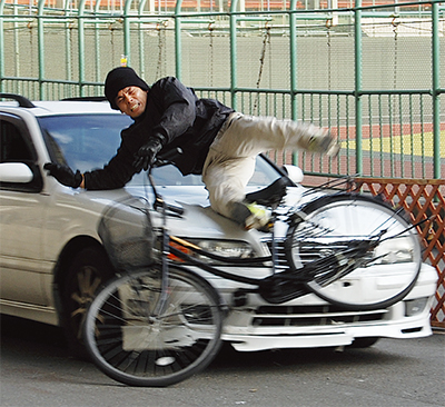 スタントマンが衝突事故を再現