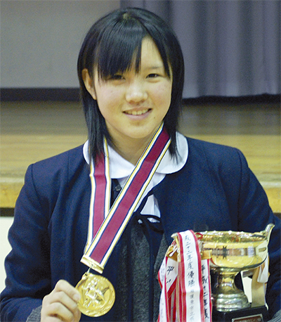 初戦から1ゲームも落とさない圧巻の試合を繰り広げ、勝ち進んだ。決勝戦では緊張のせいか自らのミスもあり、1ゲーム目を落としてしまう。後が無くなった2ゲーム目。「いつもなら焦って自分のプレーができなくなってしまう」というがこの日は違った。「すごく冷静にプレーができた」と、持ち味のフットワークを活かしたプレーを発揮し、接戦を制すと勢いに乗り次のゲームも連取。逆転で今大会を制した。「今までの練習の成果が出た。顧問の先生や先輩、チームの仲間、そして何より毎日練習に付き合ってくれた両親に喜びを伝えたい」と武内さんは優勝の喜びをこう話す。