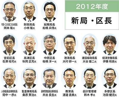 【局長級】総務局長(高津区長)船橋兵悟▽総合企画局長、飛彈良一▽財政局長(監査事務局長)小林隆▽市民・こども局長、山崎茂▽市民・こども局こども本部長(市民・こども局こども本部子育て施策部長)岡本隆▽経済労働局長(経済労働局産業政策部長)伊藤和良▽環境局長、稲垣正▽健康福祉局長、木村実▽まちづくり局長、金子弘▽建設緑政局長(建設緑政局緑政部長)大谷雄二▽港湾局長(財政局財政部長)大村研一▽川崎区長、豊本欽也▽幸区長、森下和子▽中原区長(宮前区副区長)板橋洋一▽高津区長(高津区副区長)秋岡正充▽宮前区長(中原区副区長)石澤桂司▽多摩区長(多摩区副区長)池田健児▽麻生区長、瀧峠雅介▽市民オンブズマン事務局担当理事・事務局長事務取扱、栗山敏子▽会計管理者(人事委員会事務局長)鈴木孝▽交通局長、田巻耕一▽病院局長、三浦政良▽消防局長、福井昭久▽教育長(学校教育部長)渡邊直美▽選挙管理委員会事務局長(選挙管理委員会事務局担当部長選挙課長事務取扱)井出長生▽監査事務局長(幸区副区長)桑原賢治▽人事委員会事務局長(総務局担当理事〈服務監察担当〉)間中一彦▽議会局長、小金井勉▽総務局担当理事・秘書部長事務取扱(総務局秘書部長)土方慎也▽総務局担当理事・危機管理室長事務取扱(市民・こども局市民生活部長)小林哲喜▽財政局担当理事・税務部長事務取扱(財政局税務部長)庄野愼哉▽健康福祉局担当理事・健康安全研究所整備担当(新任)岡部信彦▽健康福祉局担当理事・総務部長事務取扱(総務局人事部長)伊藤弘▽健康福祉局担当理事・市立看護短期大学事務局長事務取扱(健康福祉局総務部長)磯上充▽健康福祉局担当理事・保健医療部長事務取扱(健康福祉局保健医療部長)雨宮文明▽上下水道局担当理事・下水道部長事務取扱(上下水道局下水道部担当部長〈下水道施設担当〉)勝又進▽病院局担当理事・市立川崎病院副院長事務取扱(市立川崎病院副院長)増田純一▽病院局担当理事・市立川崎病院婦人内視鏡科部長事務取扱(市立川崎病院婦人内視鏡科部長)林保良▽教育委員会事務局担当理事・教育環境整備推進室長事務取扱(教育委員会事務局教育環境整備推進室長)海野剛志▽教育委員会事務局担当理事・総合教育センター所長事務取扱(教育委員会事務局総務部担当部長〈教育改革推進担当〉)鈴木浩之