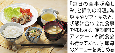 通常、数十万〜数千万かかるといわれる入居一時金が不要。将来は自宅に戻りたい人や特養に入りたい人にとっても嬉しいはず。月額入居費用は税込み21万250円(家賃・管理費・30日の場合の食費の合計)と別途(介護保険料の1割負担と実費)。