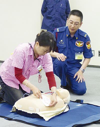 初めてAEDを操作した原かおりさんは「以前から操作方法などを学びたいと思っていた。ここでしっかり学んで、いざという時に対応できるようにしたい」と話した。