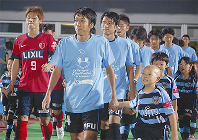サッカーJ1リーグ・川崎フロンターレと鹿島アントラーズの試合が9月15日に等々力陸上競技場で行われた。試合前には、輸血を受けたことのある子どもやその兄弟ら34人が選手と手をつなぎ入場する「ウィズハンド」などを務めた。