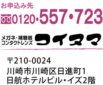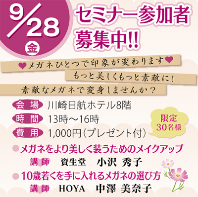 創業100年を越す老舗メガネ店「(株)メガネのコイヌマ」では9月28日(金)、「おとなのメガネで、マイナス10歳」と題したセミナーを川崎日航ホテル8階で開催する。午後1時〜4時迄。