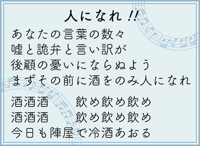 政治家、マスコミ…最近は嘘つきが多いように感じるという菊田さん。歌詞ではそんな彼らにお酒の飲むことを説く。「お酒は一日の疲れを癒し、人でなかったものが人になれる効用がある。」と菊田さんは力を込める。