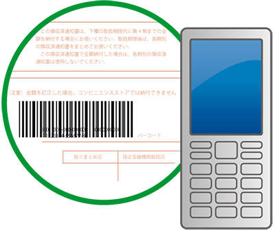 モバイルレジとは株式会社NTTデータが提供するサービスで、携帯端末を使ってインターネット経由の銀行サービスを利用する仕組み。納付書に印字されたコンビニ収納用バーコードを携帯電話やスマートフォン、タブレット端末などのカメラで読み取って利用する。