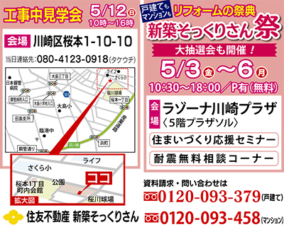 川崎エリアは築年数の古い家が多いため、土台基礎が気づかないうちにひび割れていたり、傾いている場合もある。だが「こうした場合でも、補強できるのが新築そっくりさん。ご相談ください」と担当者。当日は「土台基礎」「太陽光発電」「耐震」などをテーマに住まいづくり応援セミナーを実施する。