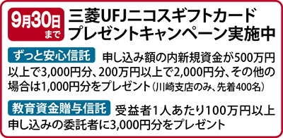 通常の預金では、口座名義人が亡くなった場合、相続人は煩雑な手続きを終えない限り金融機関で預金を引き出すことができない。 昨年3月に三菱UFJ信託銀行が発売した「ずっと安心信託」は、200万円以上3000万円まで申し込め、簡単な手続きで相続人が葬儀代や生活費を速やかに受け取れるようにした独自商品で、発売以来好評を得ている。