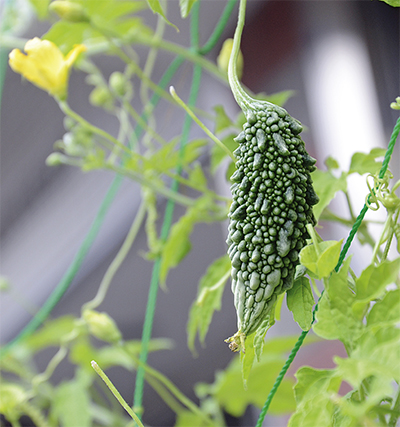 中島にある川崎沖縄県人会「はいさい保育園」(小森信園長)が栽培しているゴーヤーが、先月から実をつけはじめている=写真。