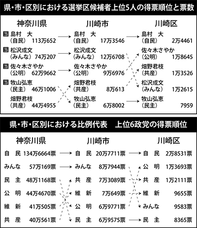 川崎区の選挙区候補者の得票数は、島村氏が2万4461票を獲得し、次いで佐々木氏が1万8645票となり、2人あわせての得票率は49%を占めた。3番目には1万3526票を獲得した畑野氏が入り、4・5番は松沢氏1万2615票▽牧山氏7959票――の順だった。