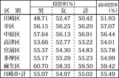川崎市選管によると、21日に投開票された参議院議員選挙の選挙区における川崎区の投票率は市内ワーストの50・42%で前回の51・93%より1・51ポイント下回る結果となった。川崎市全体の投票率は55・02%で前回より0・47ポイント下回った。