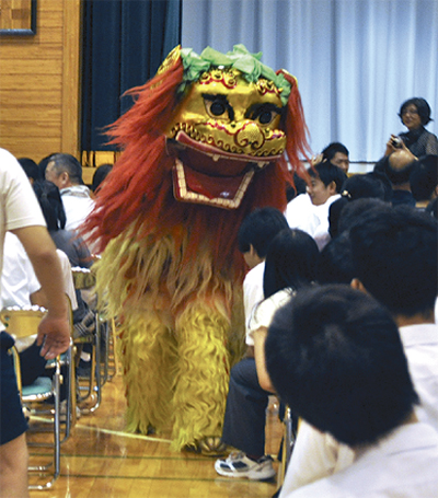 中国の伝統芸能である「獅子舞」が会場を練り歩くパフォーマンスでは、歓声が上がった。「獅子に噛まれると幸福が訪れる」という言い伝えがあるため、自ら駆け寄って頭を差し出す生徒の姿もあり、皆、手を叩いて喜んでいた。