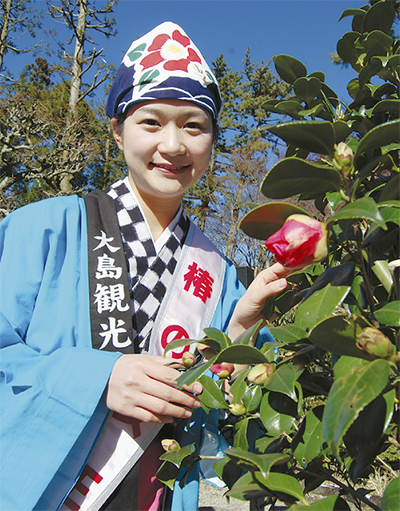 遠藤さんは5歳から新百合ヶ丘に住み、現在は学生。小田急線の車内で見た「ミス椿の女王」の募集に応募したところ、昨年2月のコンテストで総勢52人の中から3人の「女王」のうちの一人に選ばれた。1年の任期で物産展やイベントに華を添えるのが女王の使命。今月19日には箱根ホテル小涌園の復興応援企画「椿風呂」のオープンに立ち会い、椿の苗を宿泊客に配った。「大島の情報は意外と本土に届いていないと思う。川崎から竹芝桟橋で船に乗り日帰りでも行ける場所。一人でも多くの市民の方に来て頂きたい」と微笑む。