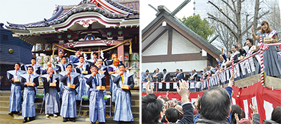 稲毛神社(写真右)でも豆まきが盛大に行われ、地元関係者や各団体の代表者、年男・年女らが舞台に揃った。参詣者は福をつかもうと、歓声を上げながら手を伸ばしていた。