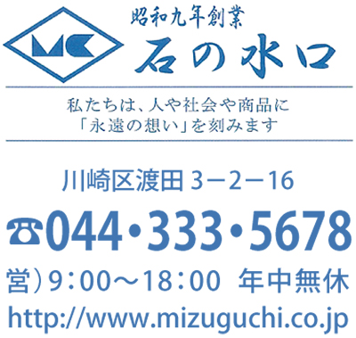 川崎区渡田で墓石の販売・施工業を営む株式会社水口。昭和9年創業の同社では、川崎市営霊園(早野聖地、緑ヶ丘)の当選者や墓地所有者からの墓石工事を受け付けている。費用は墓石代、彫刻代、免震施工代、基礎工事代含めて、4平方メートル95万円(税別)から。80年の信頼と実績を誇る老舗店だからこそ、下請け業者に任せず自社施工にこだわり、これまで様々な施工技術を取り入れてきた。