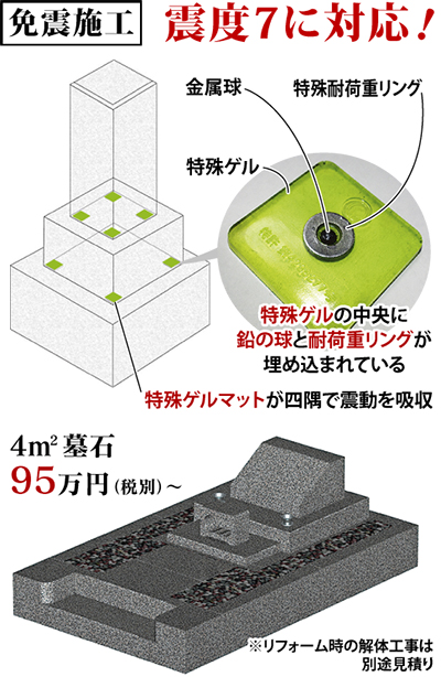 免震施工には、国内の重要文化財にも使われている新開発素材の墓石用地震対策ゲル「安震はかもりⓇ」(国内外で特許取得)を採用。揺れを吸収して逃がす素材で、正しく施工されたお墓は東日本大震災時にも1基も倒壊しなかったという。対応年数は最大40年。高度な免震施工で低コストを実現する。「安震はかもりⓇ」の正規販売店は、市内に数ある墓石店の中でも2社のみ。同社の施工技術認定者が行い、今建っているお墓にその場で施工が可能なので、川崎市周辺の寺院墓地を持つ人も必見だ。