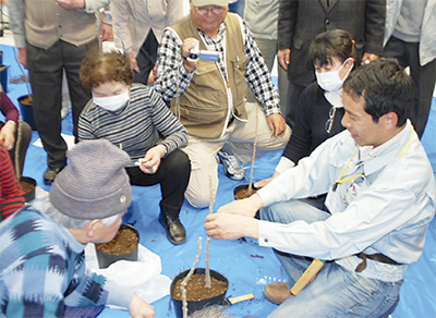 その後、参加者らは接ぎ木体験へ。関さんのレクチャーを受けながら、培養土を入れた鉢に植えた台木を適当な長さに切り、断面にはさみで切り込みを入れて、長十郎梨の穂木を接ぎ木した。昨年、東大島小の児童が配布していた接ぎ木苗をもらったという参加者は、「残念ながら枯れてしまった。今回は自分で作業もしたし、きれいな白い花を咲かせたい。楽しみだね」と話していた。