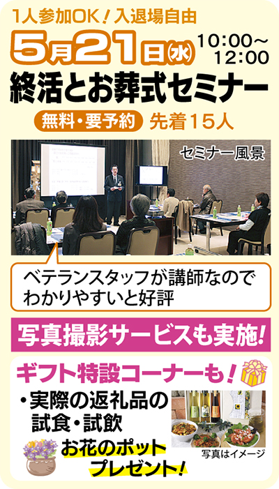 区内大島にある綜合葬祭式場「セレモニア川崎会堂」では5月21日(水)、話題の「終活」を学べる無料セミナーを開く。午前10時から正午まで。先着15人。要予約。