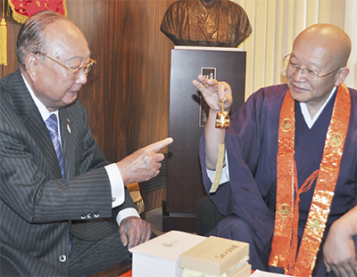 川崎大師観光協会(斎藤文夫会長)が6月21日、金の風鈴を川崎大師平間寺(藤田隆乗貫首)に奉納した。7月17日から同寺で開催される「第19回川崎大師風鈴市」へ多くの来場者を呼び込もうと、同協会の風鈴市実行委員会(森明弘委員長)が企画した。