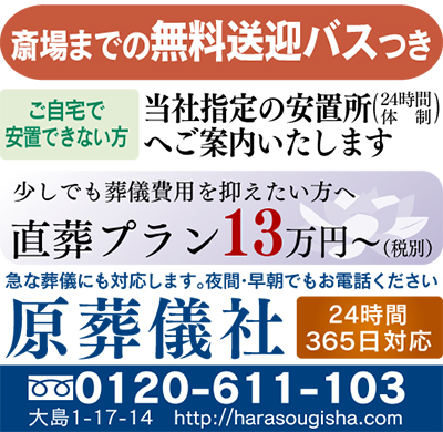 直葬から家族葬、大型葬儀までをきめ細かな対応で行う「原葬儀社」が、大島に登場した。「丁寧な進行と、合間にかけてくれる一言ひと言が胸に染みた」と、早くも利用者から評判の声があがっている。