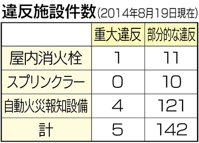 また公表対象の3項目以外にも、非常口付近に物品が置いてあるなどの消防法違反も多く見られるといい、同課では「そうした違反施設の事業者らには、即時改善などの指導を行っていき、防火に関する自主管理を徹底してもらう」としている。