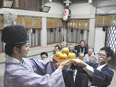 若宮八幡宮(大師駅前)で9月1日、「長十郎梨」の奉納式が行われた。長十郎梨まつり実行委員会(石渡孝明委員長)主催。