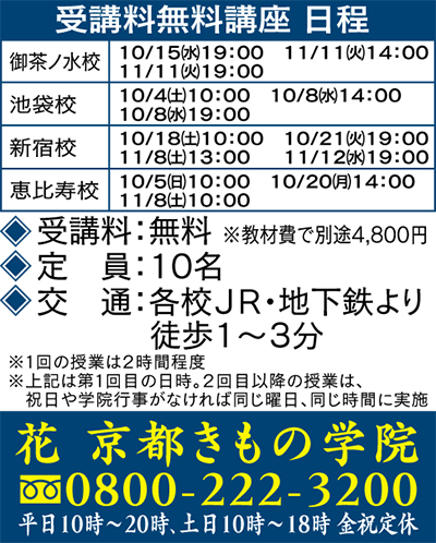 からだに負担がかからない「体にやさしい快適着付」をコンセプトに、ひとり一人と向き合う丁寧な指導が人気の「花 京都きもの学院」では、初心者を対象とした全8回の無料着付講座を10月より開講、受講者を募集している(教材費別途4800円)。